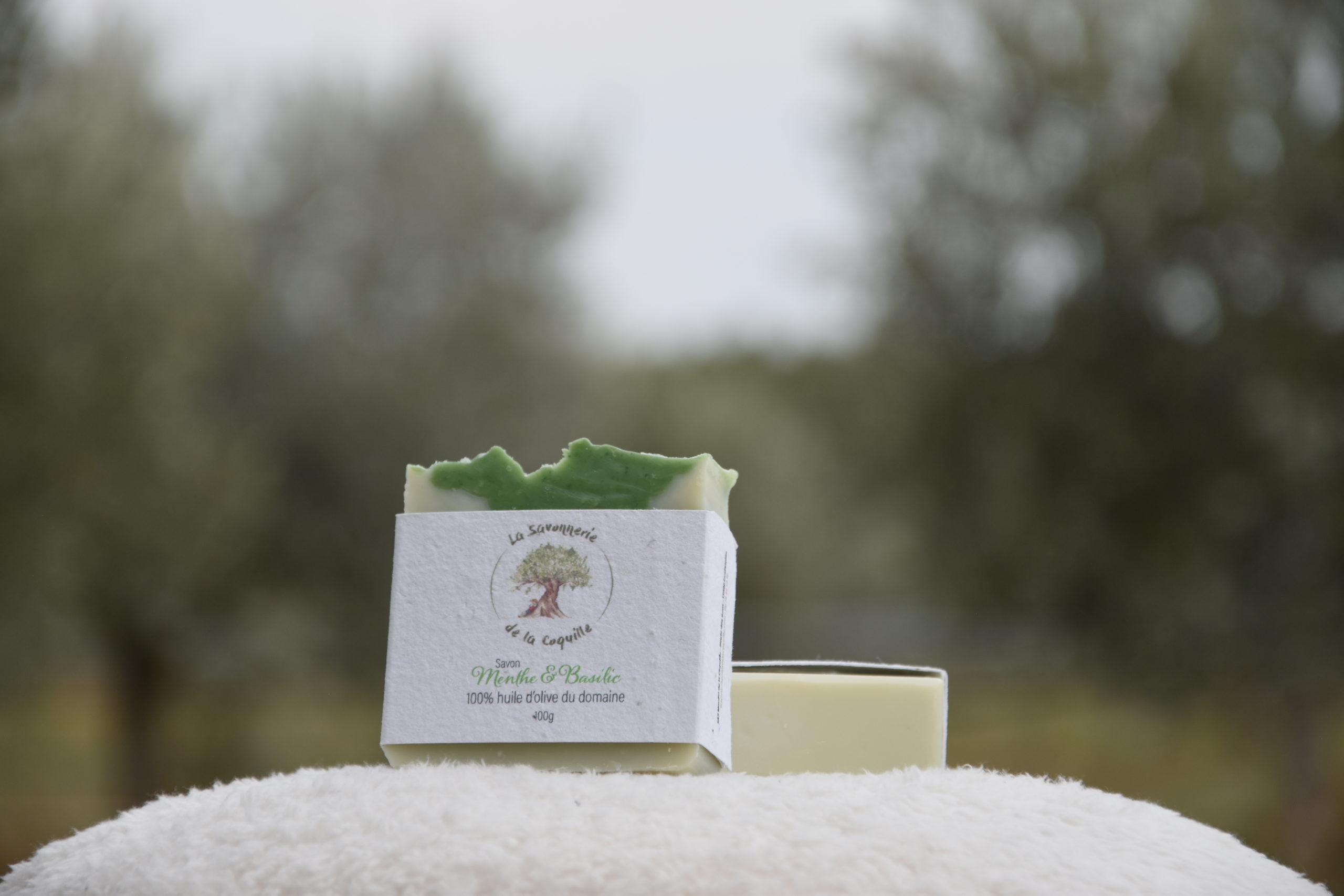 Un savon à l’odeur rafraichissante de menthe et de Basilic, fabriqué sur le domaine dans notre savonnerie artisanale.